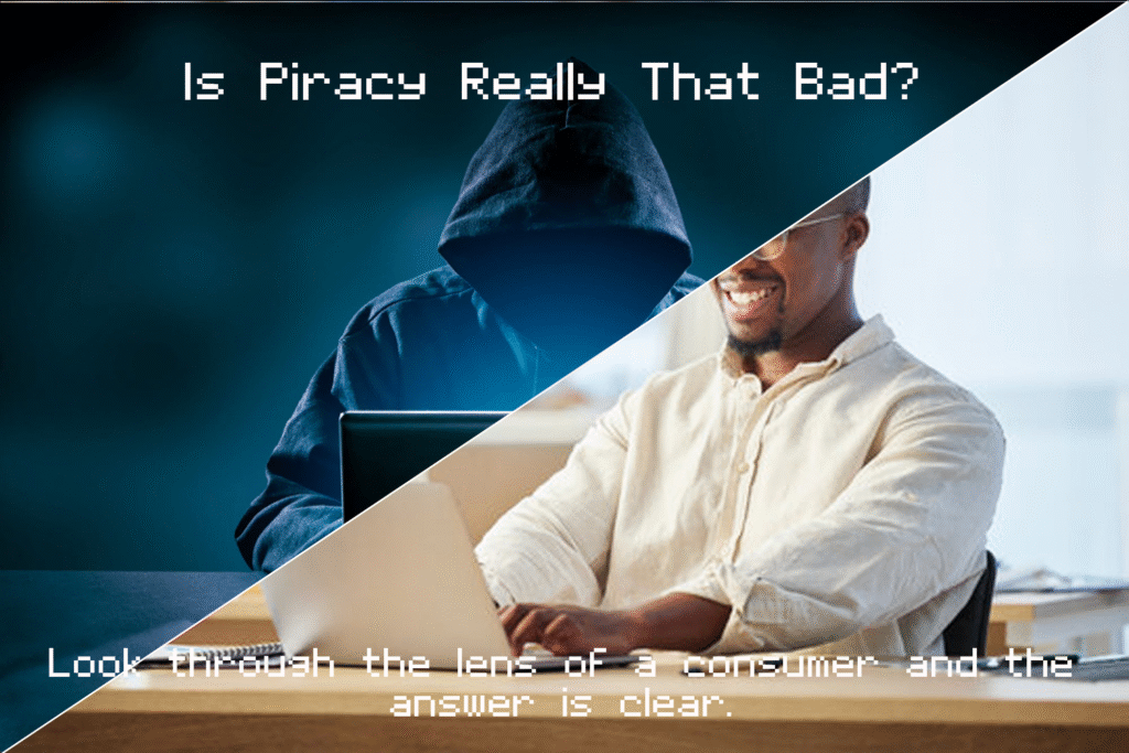 Meanwhile for the second part of the assignment, I translated my Research Paper assignment into an image. I chose a picture for my format because I am personally experienced with image editing software, especially Photoshop, and felt like I am less confident in video-making and editing software. I tried to instill pathos and logos into my work: I used a contrast between the two sides, or “perceptions,” of a pirate. One being a typical image when you think of a pirate: a suspicious figure cloaked in darkness, undoubtedly up to no good on his laptop. The other side, however, depicts a man in the light having a good time on his laptop. This was used to make the viewer identify with the person in the second image, as they personally wouldn’t see themselves as a shady individual like in the first image. I used logos in the tagline, “Look through the lens of a consumer and the answer is clear.” I’m making the user think and reason about which side they are on. When making the image, I personally struggled with achieving the specific effect I was going for with the software I used. At first, I tried to go with a page-turn effect, where the first image would be in the foreground and the second would be under it. Unfortunately, my attempts at manipulating the image didn’t look good at all to me, so I settled for the two halves in the final product, which ended up better than expected. During this process, I learned that getting a message across through a predominantly visual format is harder than expected. You have to focus on so many elements like layout and color, and not only about those individual aspects, but how they come together to make a final product.